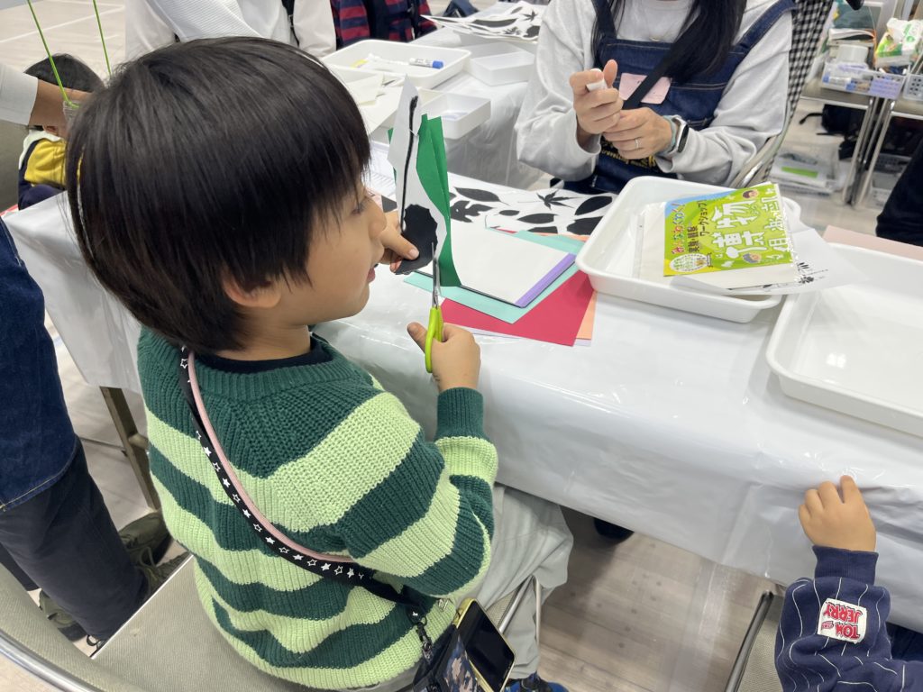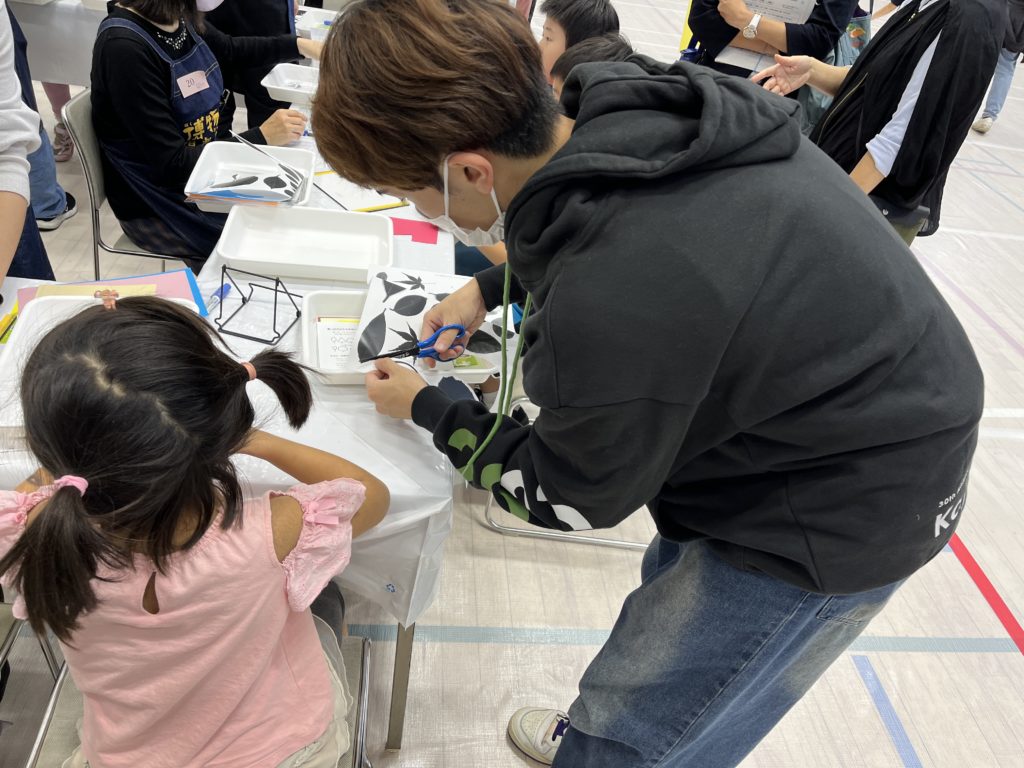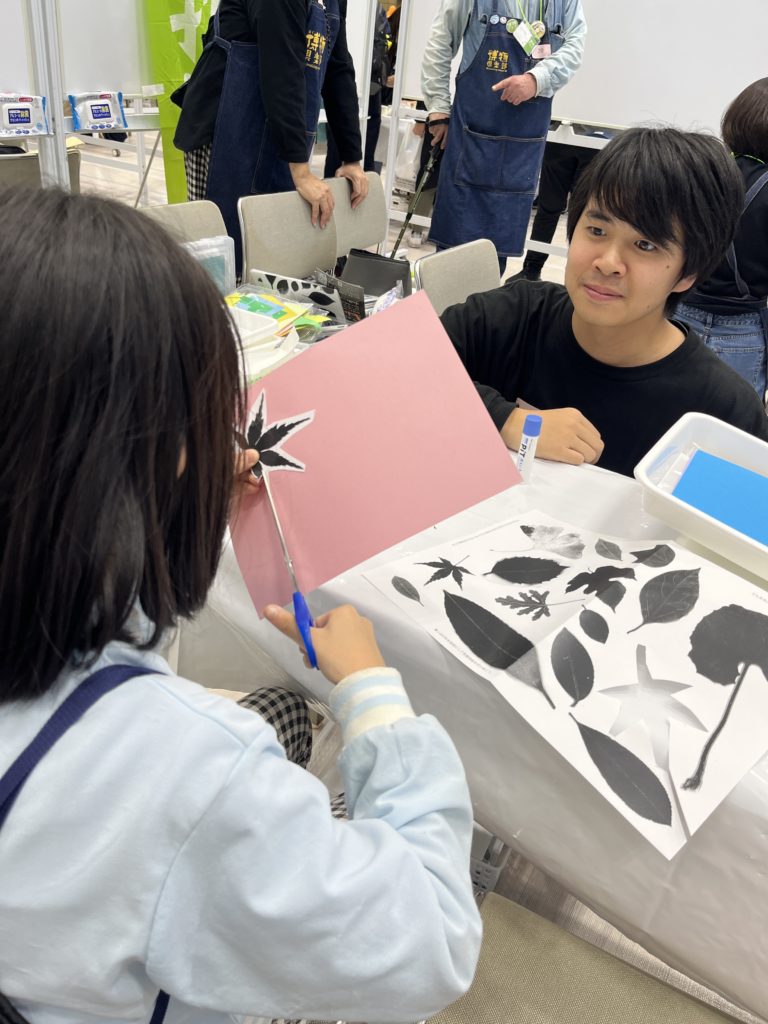 武蔵野市内在住または在学の小・中学生とその保護者を対象に開催されるこのイベントに博物倶楽部が参加するのは6回目です。今回はどんな年代の方でも気軽に参加できる「リアルな葉っぱを切りぬこう」を実施しました。